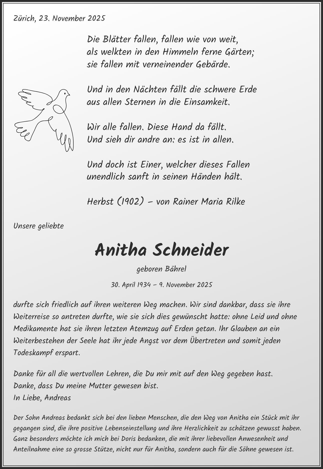 Der Sohn Andreas bedankt sich bei den lieben Menschen, die den Weg von Anitha ein Stück mit ihr gegangen sind, die ihre positive Lebenseinstellung und ihre Herzlichkeit zu schätzen gewusst haben. Ganz besonders möchte ich mich bei Doris bedanken, die mit ihrer liebevollen Anwesenheit und Anteilnahme eine so grosse Stütze, nicht nur für Anitha, sondern auch für die Söhne gewesen ist.