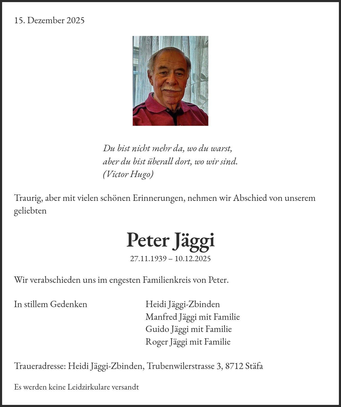 Traueradresse: Heidi Jäggi-Zbinden, Trubenwilerstrasse 3, 8712 Stäfa