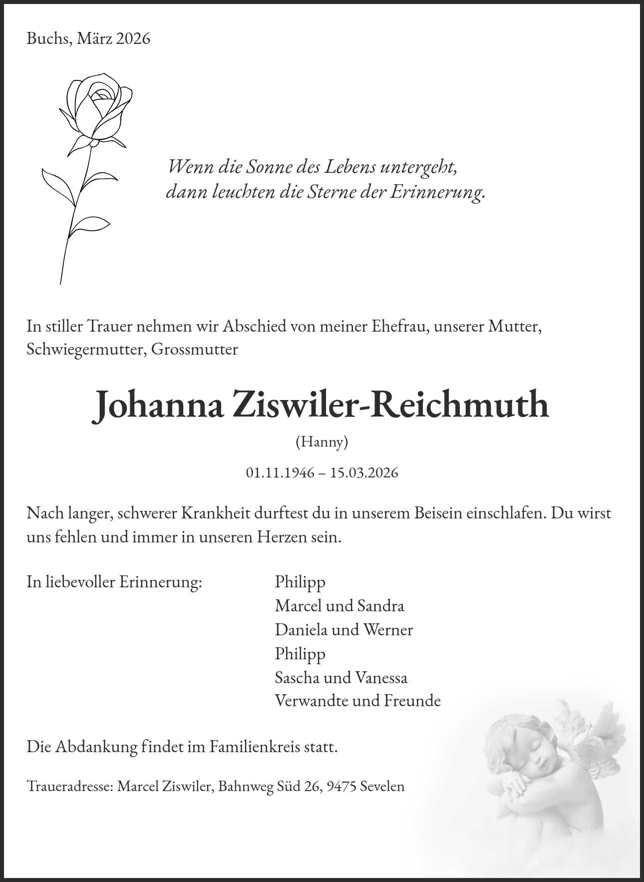 Traueradresse: Marcel Ziswiler, Bahnweg Süd 26, 9475 Sevelen