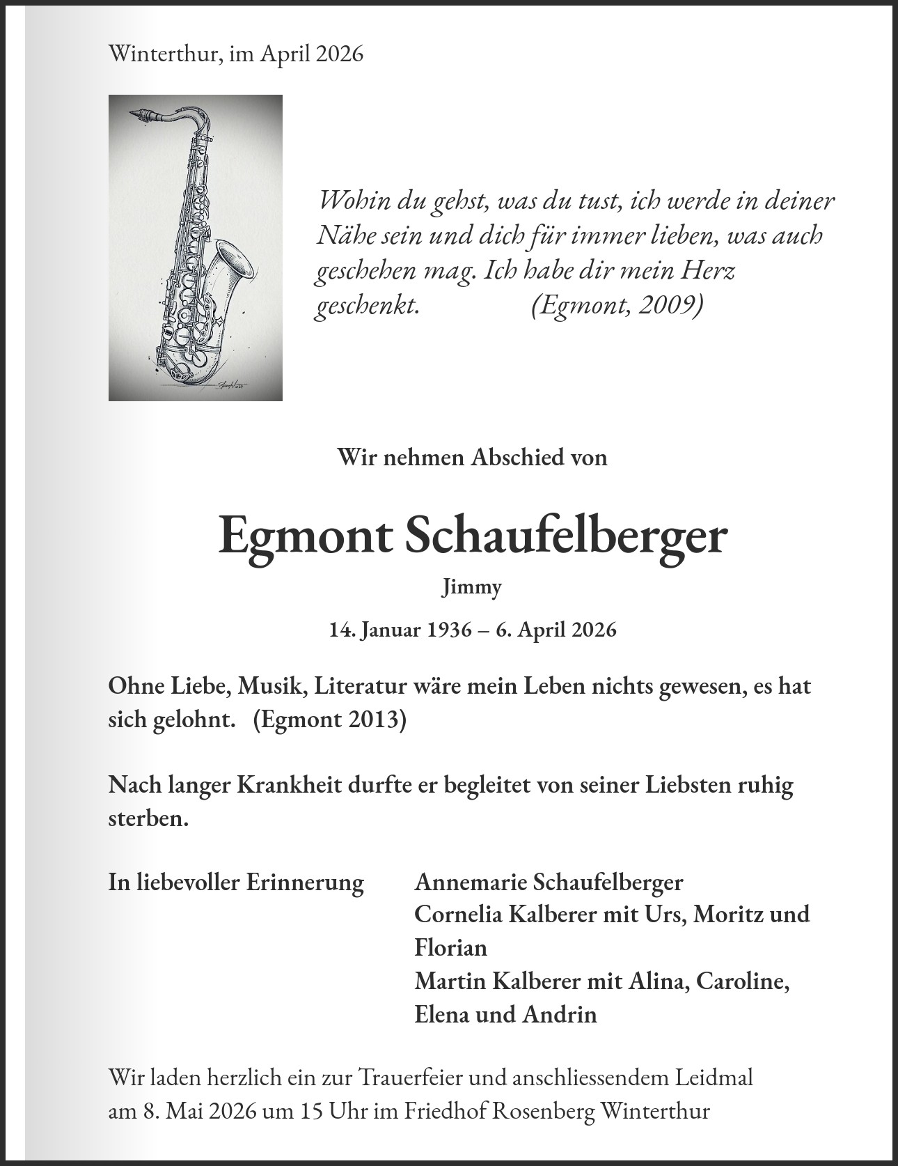 Wir laden herzlich ein zur Trauerfeier und anschliessendem Leidmal am 8. Mai 2026 um 15 Uhr im Friedhof Rosenberg Winterthur