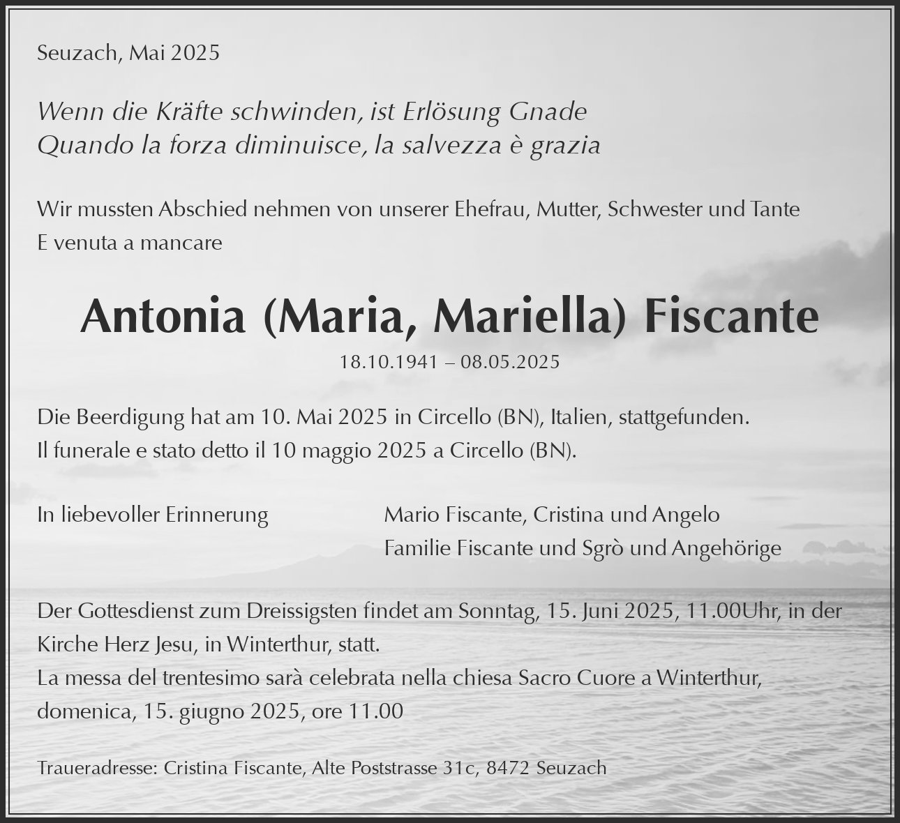 Traueradresse: Cristina Fiscante, Alte Poststrasse 31c, 8472 Seuzach