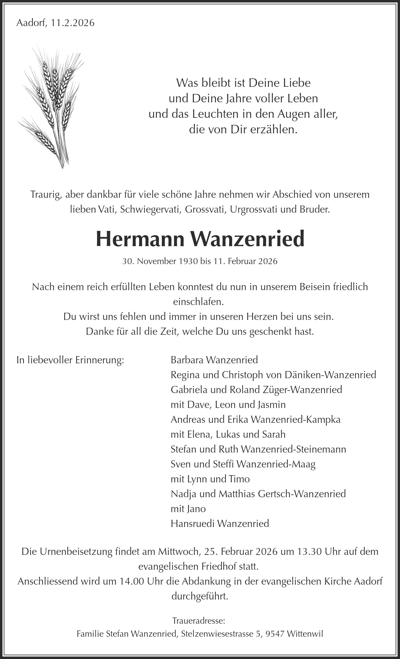 Traueradresse: Familie Stefan Wanzenried, Stelzenwiesestrasse 5, 9547 Wittenwil