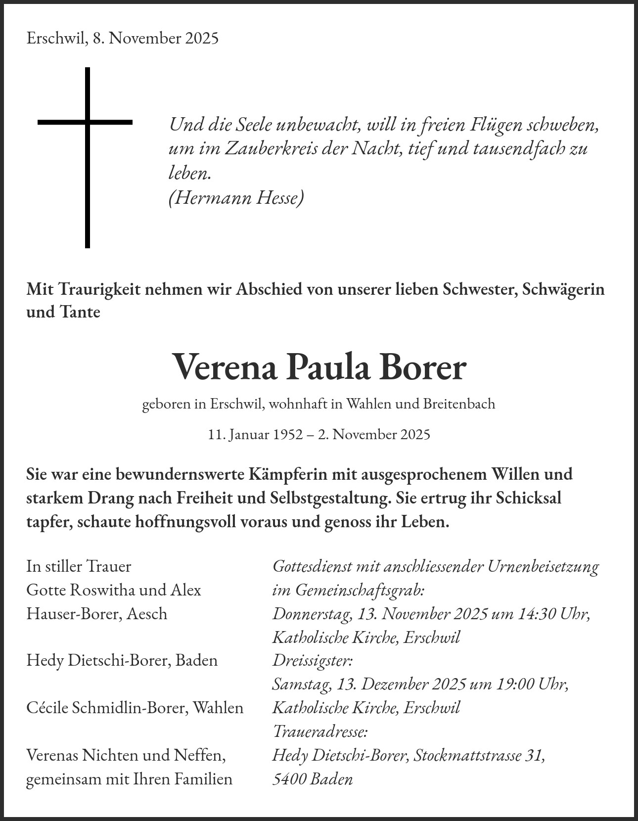 Gottesdienst mit anschliessender Urnenbeisetzung im Gemeinschaftsgrab: Donnerstag, 13. November 2025 um 14:30 Uhr, Katholische Kirche, Erschwil Dreissigster: Samstag, 13. Dezember 2025 um 19:00 Uhr, Katholische Kirche, Erschwil Traueradresse: Hedy Dietschi-Borer, Stockmattstrasse 31, 5400 Baden