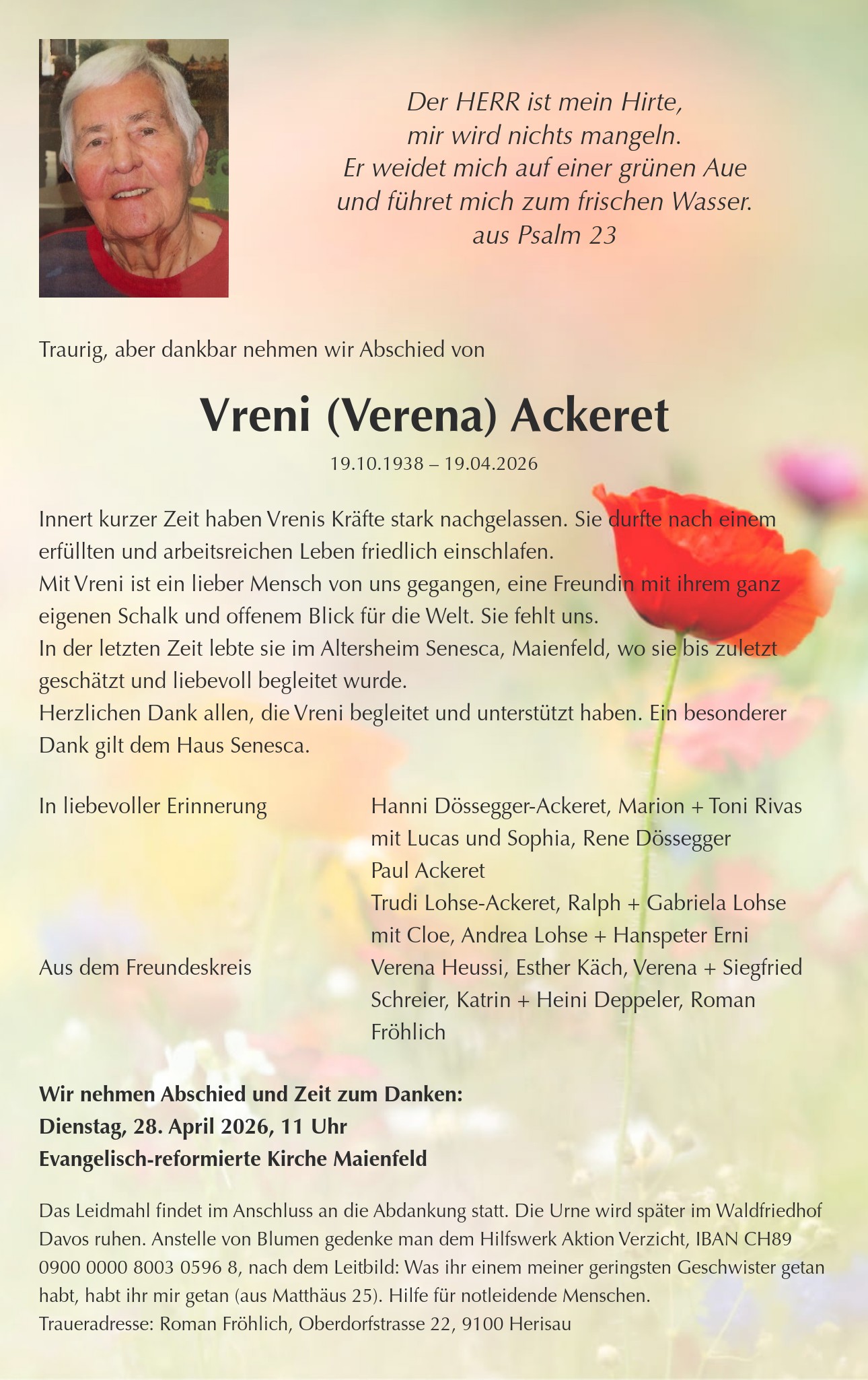 Wir nehmen Abschied und Zeit zum Danken: Dienstag, 28. April 2026, 11 Uhr Evangelisch-reformierte Kirche Maienfeld