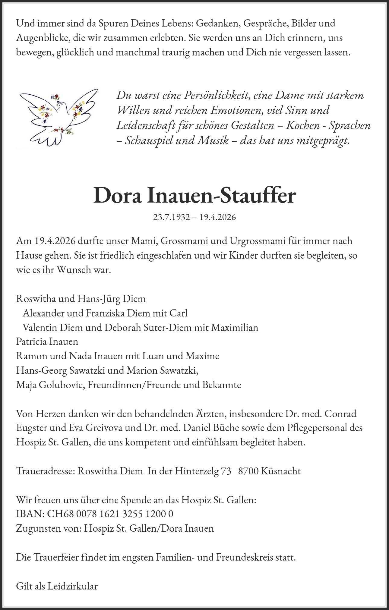 Am 19.4.2026 durfte unser Mami, Grossmami und Urgrossmami für immer nach Hause gehen. Sie ist friedlich eingeschlafen und wir Kinder durften sie begleiten, so wie es ihr Wunsch war. Roswitha und Hans-Jürg Diem Alexander und Franziska Diem mit Carl Valentin Diem und Deborah Suter-Diem mit Maximilian Patricia Inauen Ramon und Nada Inauen mit Luan und Maxime Hans-Georg Sawatzki und Marion Sawatzki, Maja Golubovic, Freundinnen/Freunde und Bekannte Von Herzen danken wir den behandelnden Ärzten, insbesondere Dr. med. Conrad Eugster und Eva Greivova und Dr. med. Daniel Büche sowie dem Pflegepersonal des Hospiz St. Gallen, die uns kompetent und einfühlsam begleitet haben. Traueradresse: Roswitha Diem In der Hinterzelg 73 8700 Küsnacht Wir freuen uns über eine Spende an das Hospiz St. Gallen: IBAN: CH68 0078 1621 3255 1200 0 Zugunsten von: Hospiz St. Gallen/Dora Inauen Die Trauerfeier findet im engsten Familien- und Freundeskreis statt. Gilt als Leidzirkular